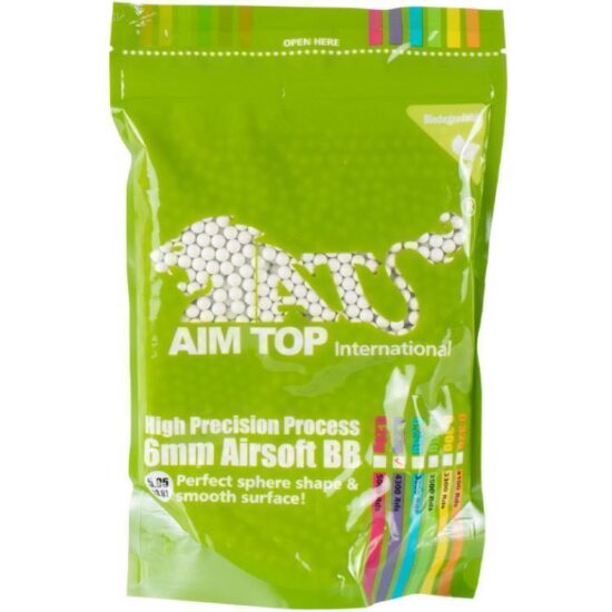 Die Marke AIM Top gehört seit Jahren zu den führenden Herstellern, wenn es um hochwertige Airsoft BBs gehen. Spieler weltweit vertrauen auf diese Premium Marke und ihre Produkte. Durch die hochwertige Verarbeitung dieser Airsoft Munition mit ihrer speziell geglätteten Oberfläche ohne Grate und Kanten fliegen die Kugeln auch auf große Distanzen extrem genau.