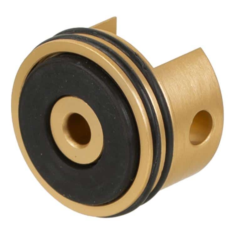 Aluminium Cylinder Head von APS mit praktischem Aufpralldämpfer in der Standardausführung. Der Gummieinsatz an der Rückseite reduziert die Schussgeräusche und schont gleichzeitig das Getriebegehäuse. Durch die doppelte O-Ring Konstruktion dichtet der Zylinderkopf hervorragend ab.