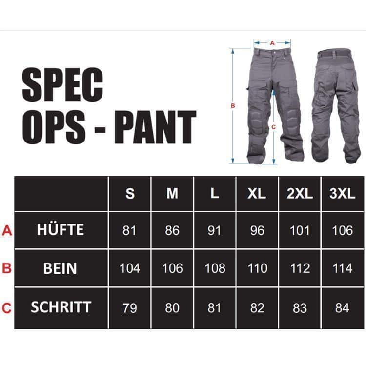 Spec-Ops Paintball / Airsoft Tactical Hose in der Version 2.0 mit überarbeitem Padding, noch angenehmerem Tragekomfort und stabielerem Material. Bereits das Vorgängermodell gehörte zu den beliebtesten Tactical Hosen im Paintballbereich. Die neue 2.0 Version hat ein noch festeres Rip-Stop Gewebe, ist dennoch flexiebeler und haltbarer als die alte Version und trägt sich so angenehm wie eine Freizeithose. Features der Spec-Ops 2.0 Tactical Hose: – Stabieler Reisverschluss im Schritt und Klett Verschluss am Bund zum festen und sicheren halt der Hose – Hüftumfang kann stufenlos angepasst werden durch Klettverschluss – Elastisches Gewebe für optimalen Tragekomfort im Schritt, auf Hüfthöhe am Rücken, sowie vorne über den Knien – 4 aufgesetzte Taschen mit kräftigen Klettverschlüssen sowie 2 offene Taschen für Zubehör – Integrierte, flexiebele und leicht gepolosterte Kneepads / Kniepads aus sehr strapazierfähigem Material (neues, flexiebeleres Design) – Fussbereich der Hose mit Klettverschluss im Umfang stufenlos verstellbar, z.B. zum Anpassen an Kampfstiefel