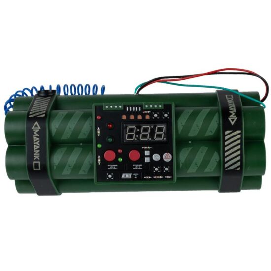 Die Bombenattrappe in Form eines Pakets Dynamitstangen simuliert das legen einer Bombe im Spielgeschehen. Dabei kannst Du den Timer von 0:10 bis 2:00 einstellen. Der Countdown lässt sich auf dem Display ablesen. Zusätzlich durch eine blinkende LED angezeigt, dass die Bombe "scharf" ist. Außerdem zählt der Countdown hörbar mit einem Piepen herunter, so dass Spieler in der Umgebung die Bombe anhand der Geräusche lokalisieren können, um sie zu entschärfen.