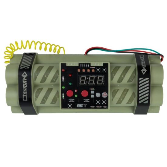 Die Bombenattrappe in Form eines Pakets Dynamitstangen simuliert das legen einer Bombe im Spielgeschehen. Dabei kannst Du den Timer von 0:10 bis 2:00 einstellen. Der Countdown lässt sich auf dem Display ablesen. Zusätzlich durch eine blinkende LED angezeigt, dass die Bombe "scharf" ist. Außerdem zählt der Countdown hörbar mit einem Piepen herunter, so dass Spieler in der Umgebung die Bombe anhand der Geräusche lokalisieren können, um sie zu entschärfen.