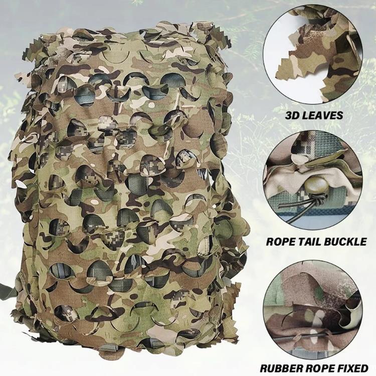 High-quality laser cut 3D camouflage net cover for backpacks. This camouflage cover offers optimal camouflage in the terrain by blurring the contours of the backpack.