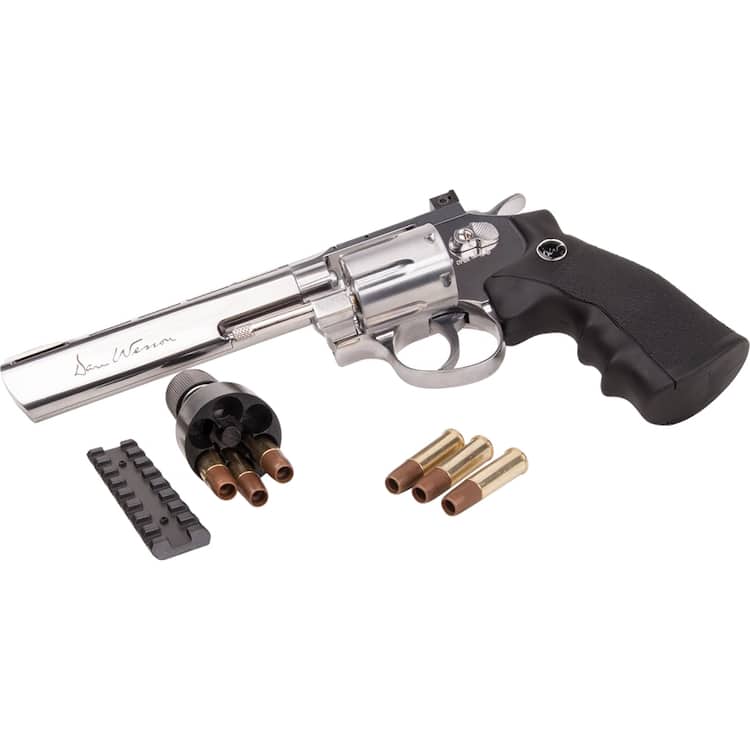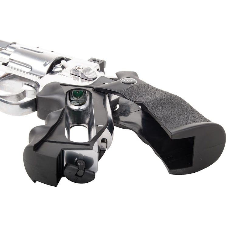 Impressive and elegant, this powerful 6-inch chrome revolver under license from Dan Wesson is sure to draw attention. It features authentic markings and a custom serial number stamped into the frame. The revolver features a double-action trigger system and adjustable rear sights for added realism and accuracy.
