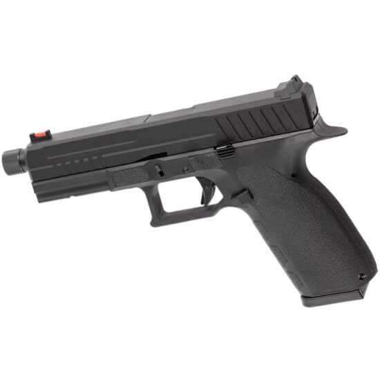 The KP-13 TBC pistol series features a metal slide and a fiber-reinforced polymer body. It also includes a 14mm CCW threaded outer barrel set with a removable thread protector.