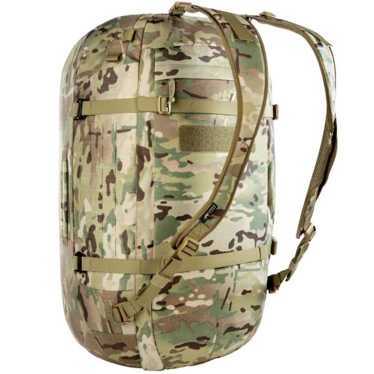 The TT Duffel 65 is easy to load thanks to the large opening in the main compartment. The main compartment is lockable. If necessary, the entire bag can be compressed and it has removable shoulder straps that can be stowed in the lid. MOLLE on the outside allows for individual extensions.