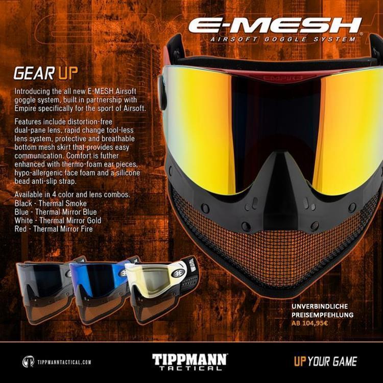 Tippmann has now taken up this idea and developed the E-Mesh protective mask. The E-Mesh is based on the highly rated Empire E-Flex paintball mask. The goggle frame, thermal lenses, ear muffs, and mask strap are all taken from the proven E-Flex and equipped with a sturdy mesh in the mouth area.