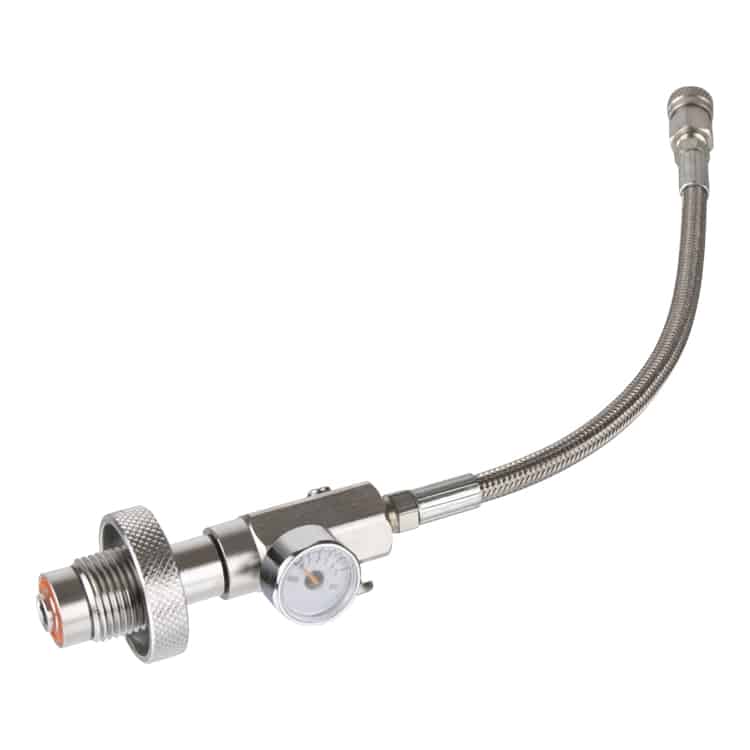 Die Füllstation verfügt über einen Stahlflexchlauch zur verbesserten Handhabung. Nach dem Füllen kann man das System über den Entlüftungsknopf entlüften und die gefüllte Flasche ganz einfach entnehmen.