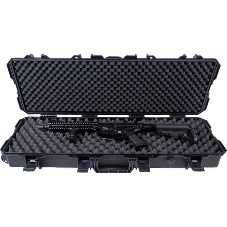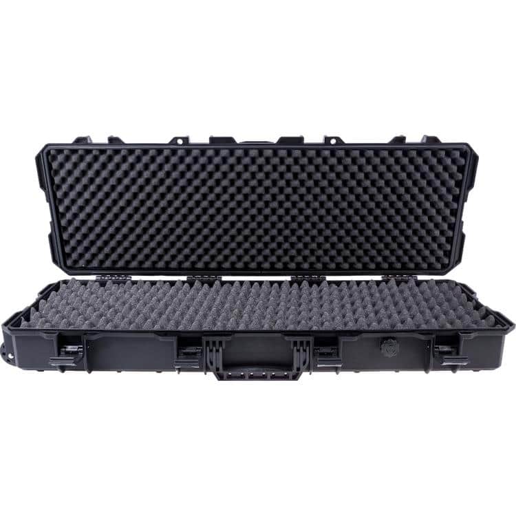 Der Phylax Langwaffenkoffer ein äußert robuster Koffer mit einem Außenmaß von (L xB xH) 100cm x 35cm x 13cm. Er besitzt einen Tragegriff und einen Griff an dem der Koffer, dank der Rollen, gezogen werden kann. Sein Innenmaß beträgt 93cm x 30cm. Somit können hier die gängisten Langwaffen und je nach Aufbau der einzelnen Airsoft, sogar zwei Langwaffen sicher transportiert werden. Der Koffer ist Staub- und Spritzwassergeschützt und kann über zwei Ösen mit einem Schloss sicher verschlossen werden. Ein weitere Vorteil an diesem Koffer ist, dass sich mehrere Koffer rutschsicher stapeln lassen. Dabei greift die Struktur der Unterseite in die Struktur der Oberseite.