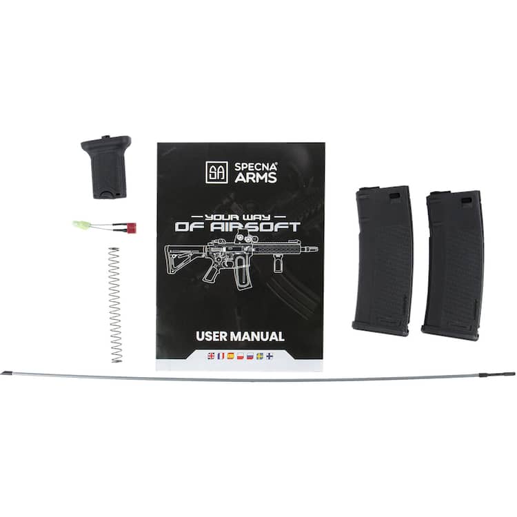 Identisch mit der Originalwaffe garantiert das Replikat Ergonomie und Manövrierfähigkeit und ermöglicht umfangreiche Modifikationen. Das SA-E39 Edge besticht durch hochwertige Komponenten mit ästhetischem Finish und robuster Konstruktion. Beide Gehäuse, Handschutz, Pufferschaft, Lauf, Mündungsfeuerdämpfer, Ladehebel, Schwenkhalterungen und weitere Kleinteile sind aus Metall gefertigt. Bolzen, Stifte und die Staubschutzkappe bestehen aus Stahl. Lediglich das Magazin und der Pistolengriff sind aus langlebigen Polymeren spritzgegossen. Im Inneren sorgt Specna Arms mit hochwertigen Teilen für Langlebigkeit und Präzision bei jedem Schuss. Ober- und Untergehäuse, Lauf, Pufferrohr und weitere Metallelemente sind mit einer matten, kratzfesten Nanobeschichtung versehen. Dies schützt die Replika vor rauer Feldanwendung und beugt Beschädigungen vor.